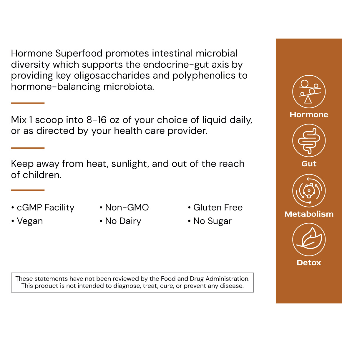 Hormone Superfood promotes intestinal microbial diversity which supports the endocrine-gut axis by providing key oligosaccharides and polyphenolics to hormone-balancing microbiota.