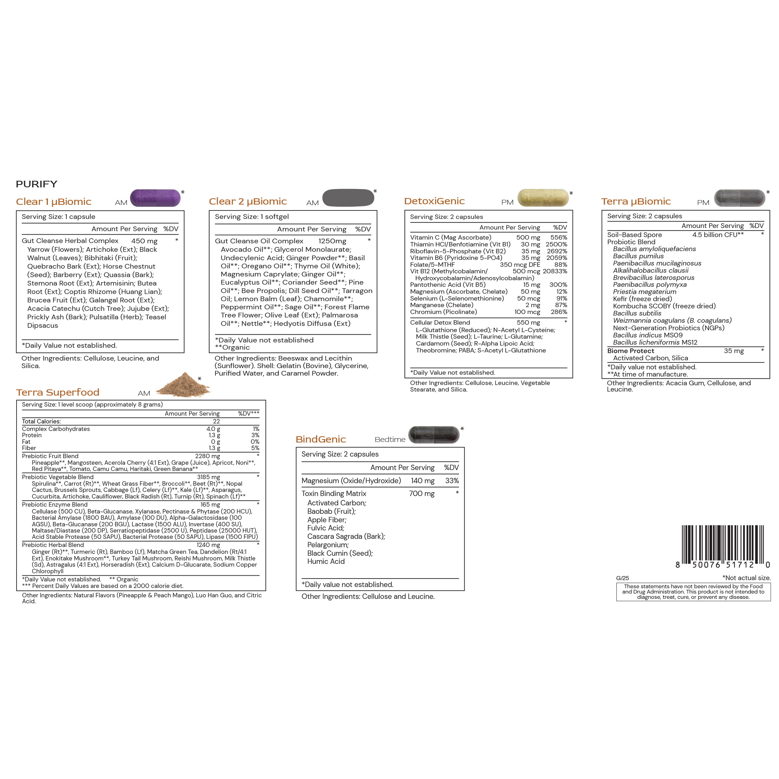 Purify combines Clear 1 µBiomic, Clear 2 µBiomic, Terra µBiomic, Terra Superfood, DetoxiGenic, and BindGenic.