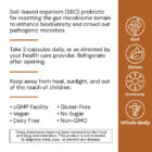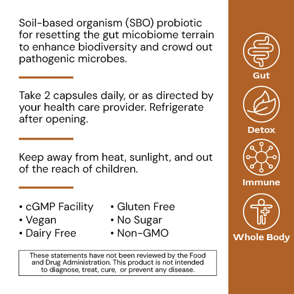 Soil-based organism (SBO) probiotic for resetting the gut microbiome terrain to enhance biodiversity and crowd out pathogenic microbes.